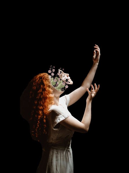 Na al deze stappen voeg ik enkel nog de zelfgekozen bloemen toe. Deze komen door de barsten in het gezicht die ik later toevoeg volgens dezelfde techniek als hierboven omschreven. De bloemen komen onder de gezichts-kopie laag. Zo krijg je de illusie dat ze erdoor groeien.